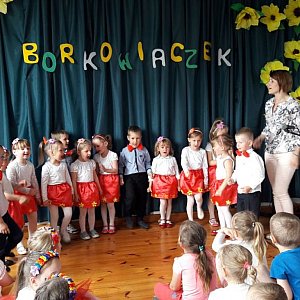 Przedszkole w Borkach reprezentowały dzieci z grup: ,,Żabki``, ,,Pszczółki`` i ,,Biedroneczki". Do występu przygotowane zostały pod czujnym okiem swoich pań: Agnieszki Górnej, Agnieszki Bielewskiej i Edyty Gruchoły. Uroczystość otworzyła pani Iza Smogorzewska witając ciepło wszystkich młodych wykonawców. Uczestnicy z Bork wystąpili z następującym repertuarem: