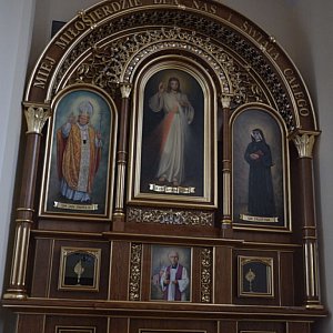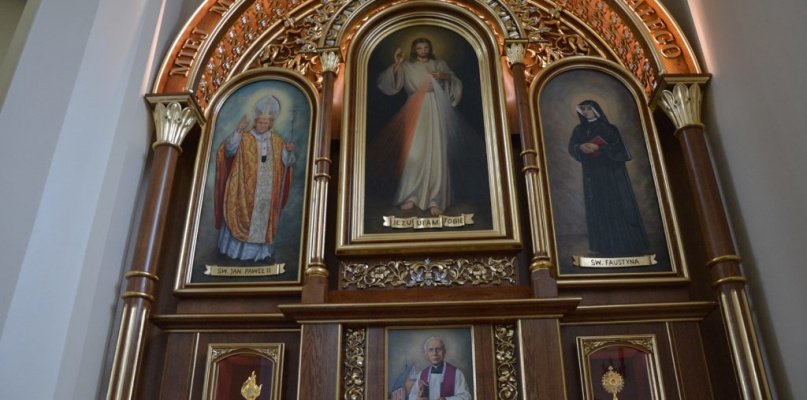 Ołtarz jest wykonany z dużym kunsztem i dbałością o detale. Główny obraz przedstawia oczywiście Jezusa Miłosiernego, który objawił się św. Faustynie. Po bokach widnieją z kolei portrety właśnie siostry Faustyny i św. Jana Pawła II. Poniżej widzimy jeszcze obraz bł. ks. Michała Sopoćki, spowiednika wizjonerki.W ołtarzu znajdują się także relikwie - włosy Jana Pawła II i kawałek szaty bł. ks. Jerzego Popiełuszki. W przyszłości mają dotrzeć tu relikwie św. Faustyny Kowalskiej.