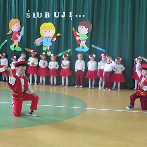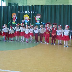 Rozpoczęła ją dyrektor szkoły pani Teresa Wierzchowska, która powitała wszystkich i skierowała gorące słowa do najmłodszych w swoich grupach wiekowych celebrantów. Piękny i przesycony nawiązaniami patriotycznymi program artystyczny, przygotowany pod kierunkiem wychowawczyń - p. Mirosławy Kazaneckiej i p. Anny Celińskiej, wzruszył do głębi wszystkich oglądających. Dla dzieci było to ogromne przeżycie, ale trzymały się bardzo dzielnie. Odpowiadały na pytania dotyczące naszej ojczyzny, nauki oraz zasad zachowania, śpiewały piosenki, recytowały wiersze i zatańczyły krakowiaka. Ukoronowaniem uroczystego charakteru spotkania był występ przedszkolaka w stroju Orła Białego.