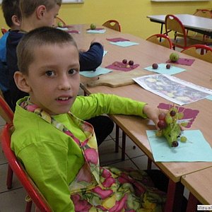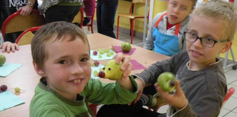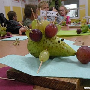 Następnie, zmotywowani uczestnicy warsztatów, pod okiem Agnieszki Jaszcz nauczyli się przygotowywać z podanych składników Owocowe Jeże, zdrowe i inspirujące dziecięcą kreatywność propozycje na drugie śniadanie, zachęcające owocowych "niejadków" do ich spożywania. Uczniowie popuścili wodze fantazji i wszystkie Jeże - piękne i różnorodne, przybrały formy często wykraczające poza nakreślone zadaniem ramy.