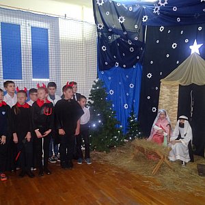 Pani dyrektor Dorota Wysokińska podziękowała w imieniu społeczności szkolnej za jakże miły akcent świąteczny i poprosiła uczniów o wręczenie przybyłym na tę uroczystość własnoręcznie wykonanych upominków. Takie spotkania to nie tylko Jasełka czy dzielenie się opłatkiem. To radość i szczęście że można być razem i pośpiewać kolędy.