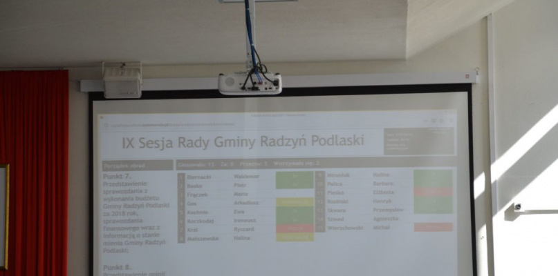 Sprawozdanie z budżetu przedstawiła skarbnik. Planowane dochody w 2018 r. w kwocie 39 702 298 zł, zostały wykonane w wysokości 37 955 847 zł, to jest 95,6% ustalonego planu. Dochody bieżące zostały wykonane w wysokości 96,49%. Dochody za zadania zlecone w wysokości 97,96%. Z działań podatków dochodowych są to kwoty w wysokości 8 451 990 zł, co stanowi 98,91% zakładanego planu. Dochody te stanowią 22,27% wszystkich zrealizowanych dochodów gminy. Dochody z tytułu opłat za wywóz nieczystości stałych zostały zrealizowane w wysokości 99,81%. Podejmowane są również działania windykacyjne, w związku z tym, w 2018 r. wystawiono 1280 upomnienia za niezapłacenie w terminie podatków, 217 tytułów wykonawczych, 586 upomnień z tytułu opłat za wodę, 957 upomnień za odpady komunalne i 343 tytuły egzekucyjne. W 2018 r. umorzono również zaległości podatkowe na kwotę 7 450 zł. Planowane wydatki gminy to kwota 42 134 007, zostały zrealizowane w wysokości 40 532 111 zł, co stanowi 96,20%. Wydatki bieżące zostały zrealizowane w wysokości 95,45%. Przedstawienie opinii "Opiniuje się pozytywnie wniosek Komisji Rewizyjnej radny gminy Radzyń Podlaski w sprawie udzielenia absolutorium wójtowi gminy z tytułu wykonania budżetu za 2018 r."