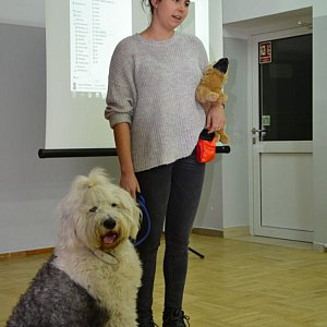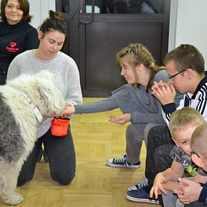 Pani Monika - dogoterapeutka przybyła z psem wabiącym się Ernesto - owczarkiem staroangielskim - i jego pluszowym towarzyszem, na przykładzie którego zaprezentowała jak należy prawidłowo pochodzić do psa i go głaskać. Opowiedziała jakie emocje towarzyszą psu w konkretnych sytuacjach, jak sobie z nimi radzić.