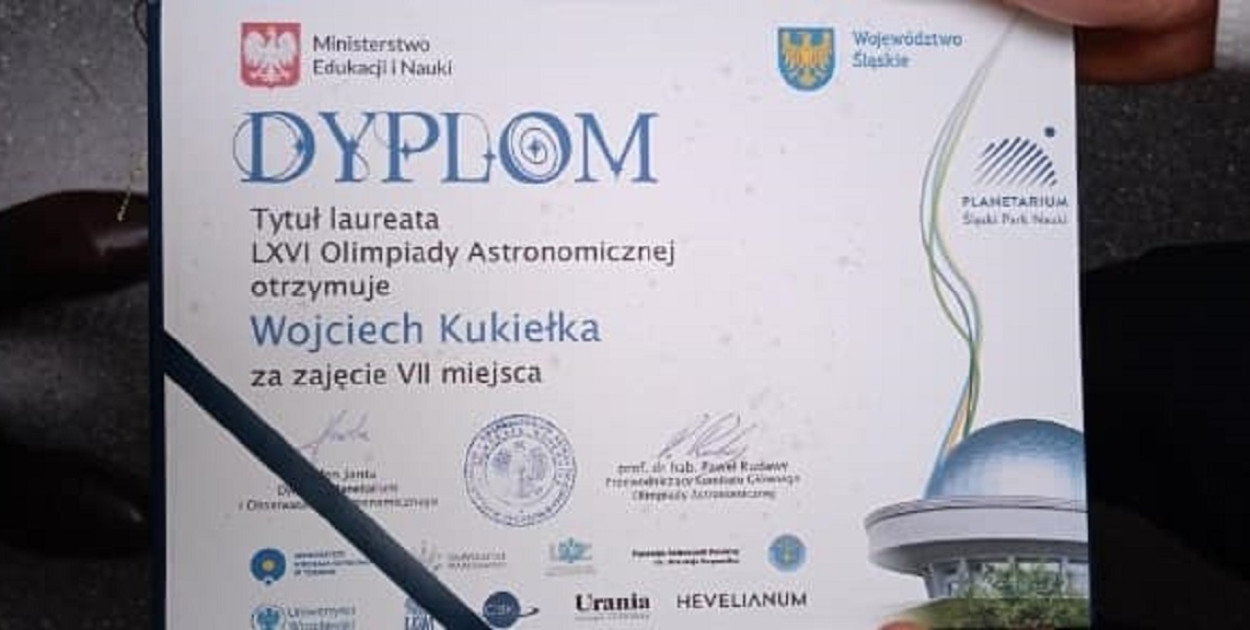 Wojciech Kukiełka, uczeń I Liceum Ogólnokształcącego w Radzyniu Podlaskim, może się pochwalić kolejnym sukcesem. Został on laureatem LXVI Olimpiady Astronomicznej w Chorzowie. Do tego konkursu, podobnie jak do innych, w których brał udział, przygotowywany był przez nauczyciela fizyki Leszka Szalasta.