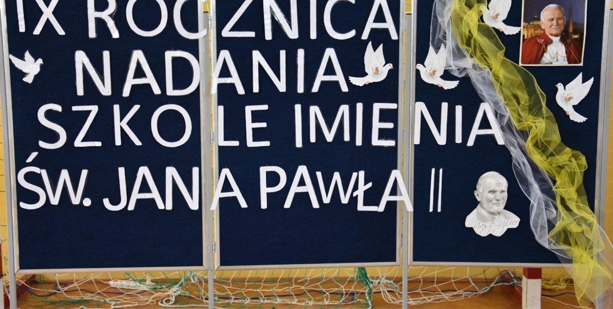 Uroczystość rozpoczęła się wprowadzeniem pocztu sztandarowego oraz odśpiewaniem hymnu szkoły. Dyrektor Mirosław Chudziak powitał zaproszonych gości: przewodniczącą Rady Gminy - Barbarę Palicę, księdza dziekana Krzysztofa Pawelca oraz całą społeczność szkolną. W trakcie przemówień wszyscy zwrócili szczególną uwagę na postać świętego Jana Pawła II, na to, jakim człowiekiem był i jak pozostał przez nas zapamiętany. Wszyscy zgodnie podkreślali, że patron to bardzo ważna postać w życiu szkoły. Wokół niej buduje się tradycje, wprowadza uczniów w świat wartości.