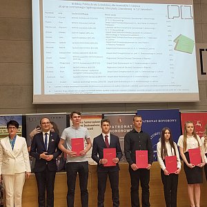 Dwoje laureatów ZSP - Izabela Karczmarz i Piotr Piasko - zajęło I miejsce i otrzymało "Indeksy Politechniki Lubelskiej", co gwarantuje im przyjęci na I rok studiów Politechniki Lubelskiej z pominięciem warunków postępowania kwalifikacyjnego. Indeksy wręczył laureatom dr hab. inż. Paweł Droździel, profesor uczelni, prorektor Politechniki Lubelskiej do spraw studenckich wspólnie z Radosławem Brzózką pełnomocnikiem ds. strategii edukacyjnej MEIN, drem Mariuszem Banachem, zastępcą prezydenta miasta ds. oświaty i wychowania i Bożeną Ćwiek, dyrektorem Oddziału Edukacji Urzędu Marszałkowskiego Województwa Lubelskiego.