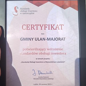 Spośród 75 jednostek samorządu terytorialnego województwa lubelskiego gmina Ulan-Majorat otrzymała certyfikat potwierdzający wdrożenie standardów obsługi inwestora w ramach projektu "Standardy Obsługi Inwestora w Województwie Lubelskim".