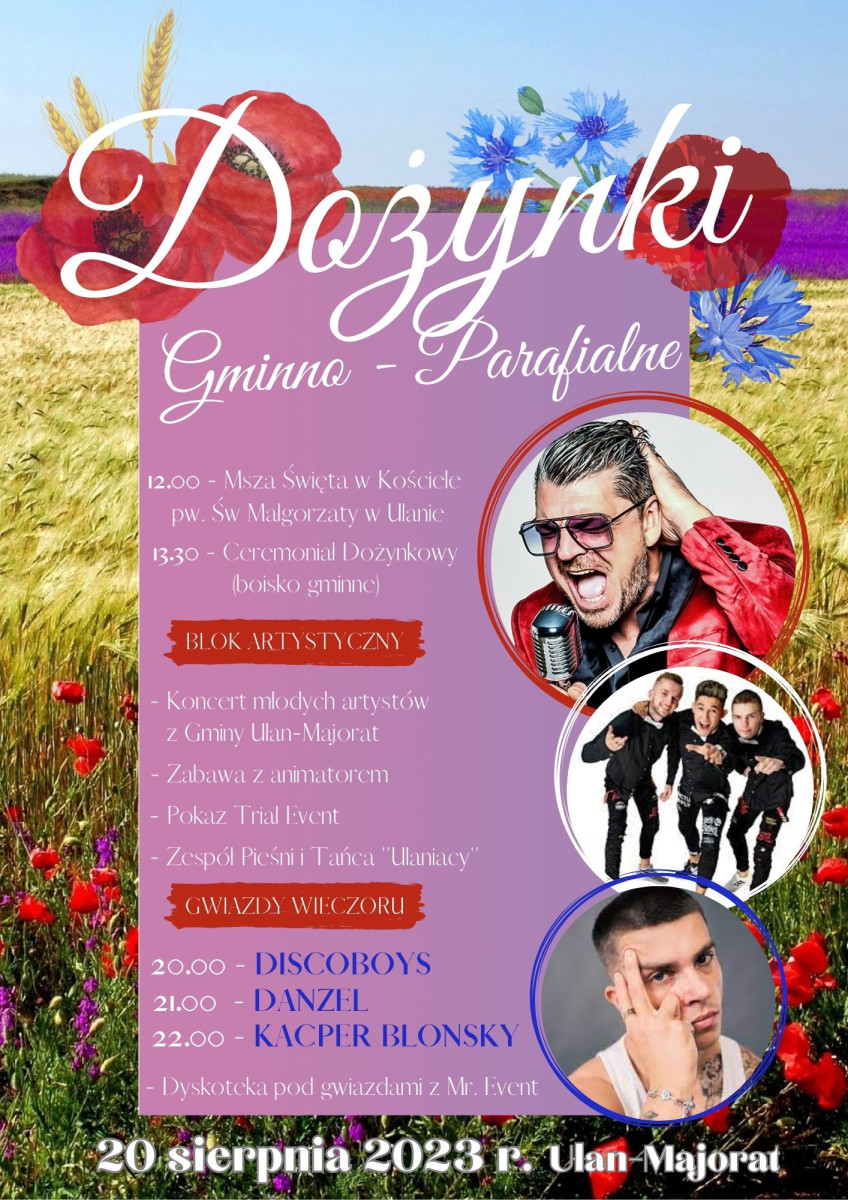 Gmina Ulan-Majorat zaprasza na Dożynki Gminno-Parafialne, które odbędą się 20 sierpnia. Więcej szczegółów na plakacie: