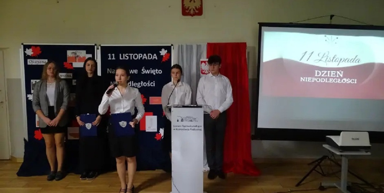 105. rocznicę odzyskania przez Polskę niepodległości społeczność Liceum Ogólnokształcącego im. Ziemi Podlaskiej w Komarówce Podlaskiej świętowała dwukrotnie – 10 listopada w budynku LO w obecności wójta gminy Komarówka Podlaska, pana Ireneusza Demianiuka, oraz w sobotę 11 listopada w hali sportowej Szkoły Podstawowej podczas gminnych obchodów Święta Niepodległości.