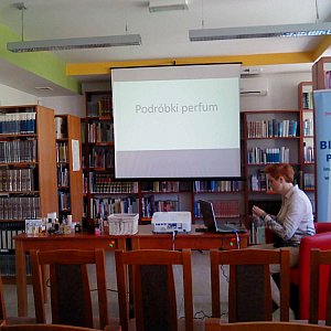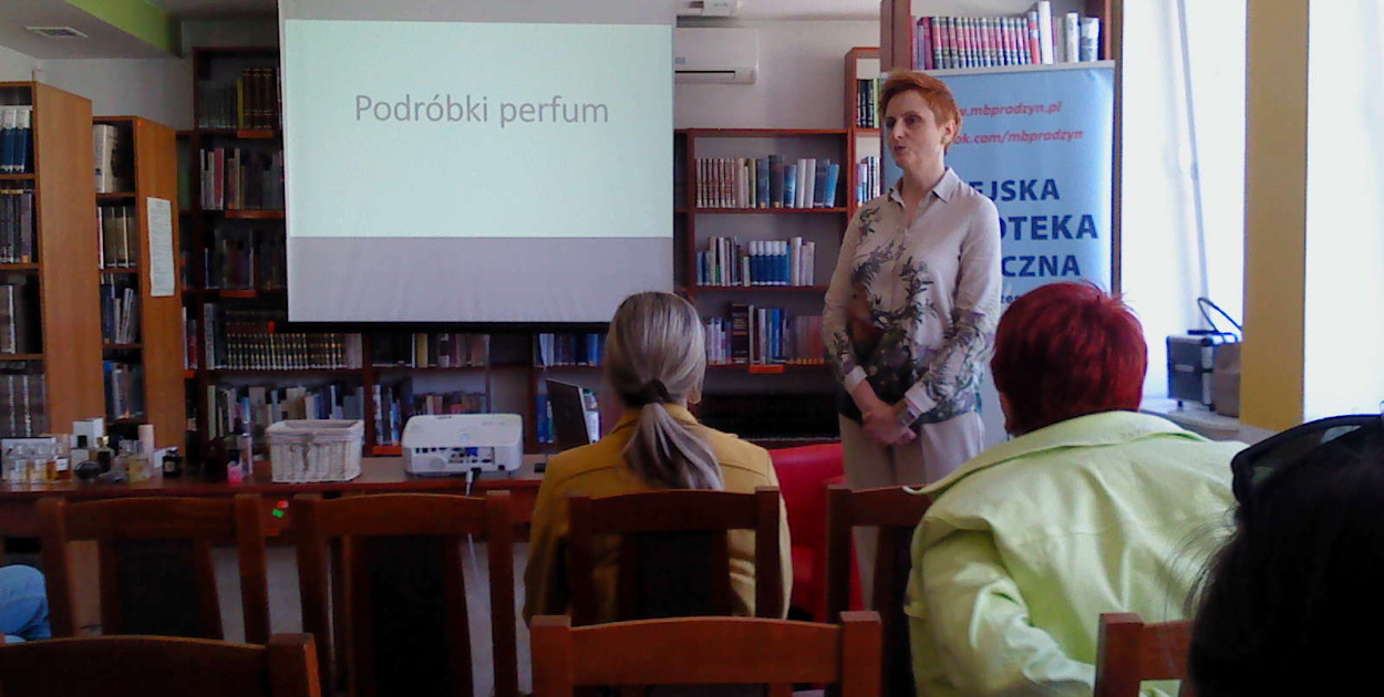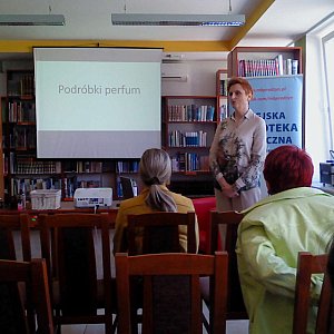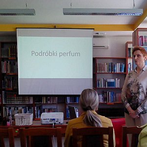 Jolanta Dymowska jest senselierką, czyli specjalistką od zapachów, zwłaszcza zapachów perfum. W trakcie opowiadała o nich. Na początku spotkaniu ogólnie mówiła o znaczeniu zapachów w życiu człowieka, mówiąc o tym w kontekście psychologicznym, a nawet przedstawiając krótki rys historyczny. Potem przeszła do perfum. Wyjaśniała, że często pachną one inaczej, bo formuły są zmieniane ze względy na badania szkodliwości składników skutkujące wycofywaniem niektórych z nich. Czasami te same perfumy pachną inaczej wskutek interakcji z konkretnym ciałem. Czasami tylko wydaje się, że pachną inaczej wskutek niewłaściwego przechowywania. Zalecała, by trzymać je w suchym, zacienionym miejscu o stałej, nie za wysokiej temperaturze, z dala od kaloryferów.