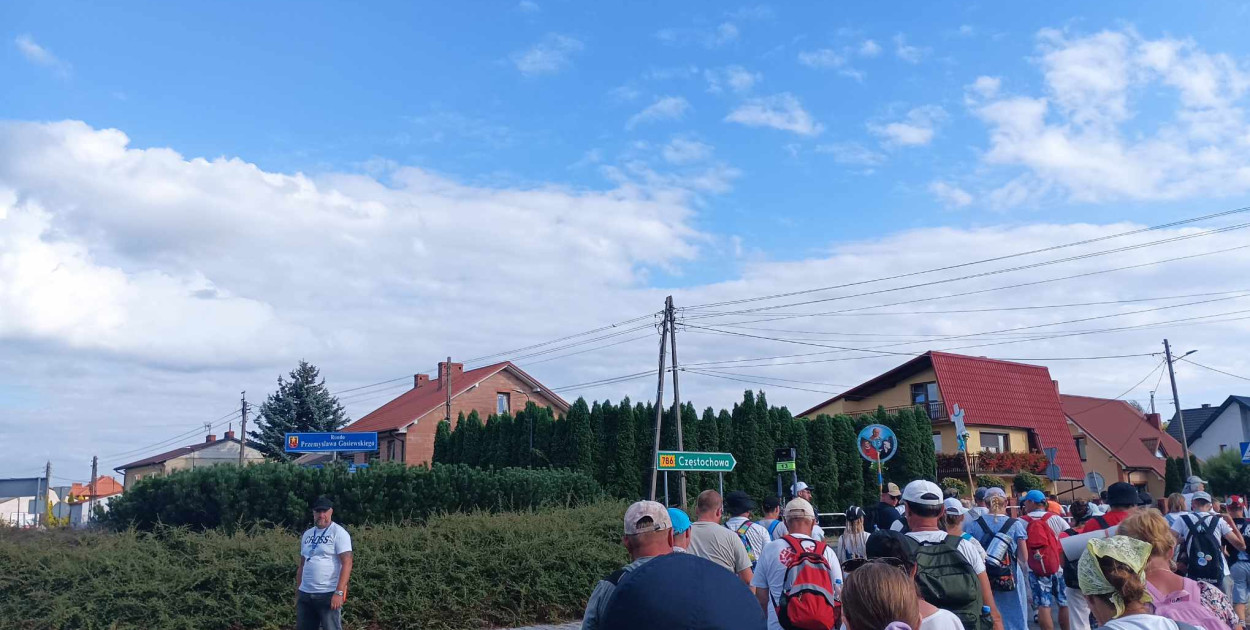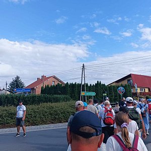 Do Częstochowy zostało nam już tylko trochę więcej niż 60 km! (Od wczoraj towarzyszy nam znak informujący o tym). Za nami etap z Eustachowa do Czarnych długości 32 km. Po Mszy Świętej, która zaczęła się wyjątkowo o 6.30, wyruszyliśmy na szlak. Na pierwszym postoju przemarsz zrekompensował się tym, że mieliśmy odpoczynek trwający godzinę (nie pół). Mieliśmy dwa postoje obiadowe - w Krasocinie i we Włoszczowej. Po drodze mijali nas pielgrzymi rowerowi. Na nocleg doszliśmy około 18.00.