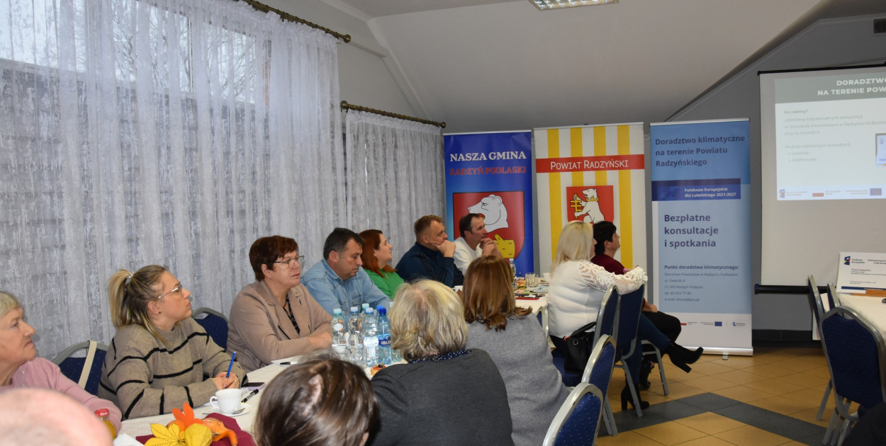 10 grudnia w Starostwie Powiatowym w Radzyniu odbyło się spotkanie przedstawicieli gminy Radzyń Podlaski - wójta i jego współpracowników, radnych oraz sołtysów - z Aleksandrą Końką i Wojciechem Wawakiem, pracownikami Starostwa, pracującymi jako t. zw. doradcy klimatyczni. Na spotkaniu poruszano tematy związane z klimatem, a także z bioróżnorodnością i retencją.