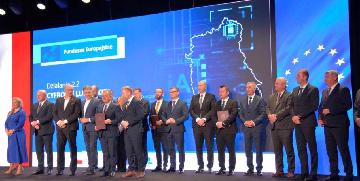 Wójt gminy Radzyń Podlaski, Daniel Grochowski, wraz z burmistrzem miasta Radzyń Podlaski, Jakubem Jakubowskim, oraz wójtem gminy Borki, Marcinem Czyżakiem, odebrali od marszałka województwa lubelskiego Jarosława Stawiarskiego umowę na realizację projektu "Bezpieczny e-portal Miejskiego Obszaru Funkcjonalnego Radzynia Podlaskiego".