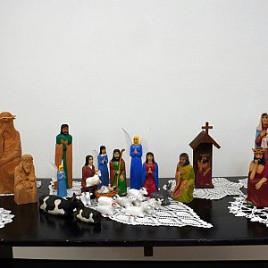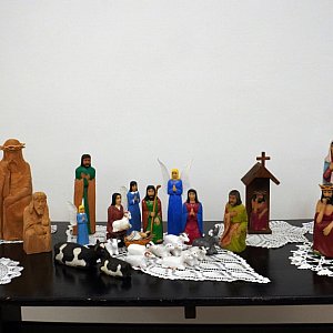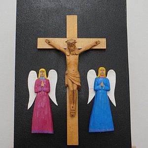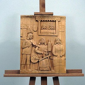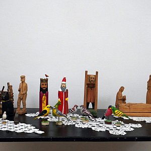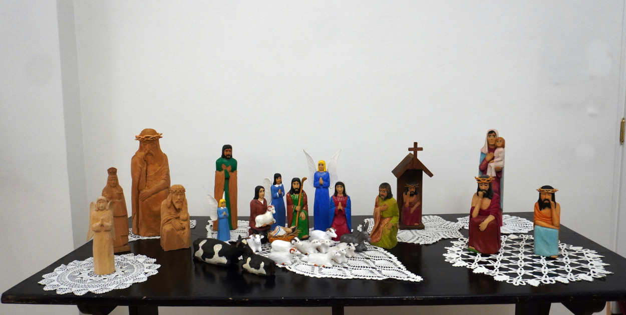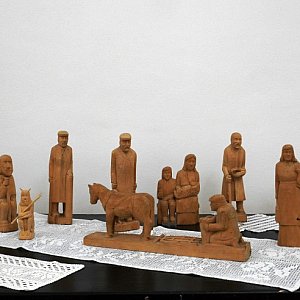 Jak wskazuje sam tytuł wystawy, można na niej zobaczyć rzeźby i płaskorzeźby wykonane w drewnie, stylizowane na sztukę ludową. Dominują rzeźby o tematyce religijnej, nawiązujące do dawnych rzeźb z kapliczek, ale są też sceny rodzajowe, przedstawienia ptaków i inne.
