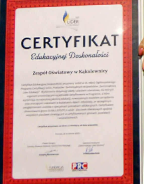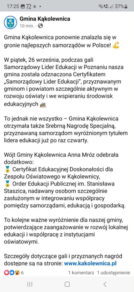 chciałbym zapoznać Państwa z informacjami, które ukazały się na stronie FB gminy Kąkolewnica 30 września br. Otóż gmina pochwaliła się sukcesem, że Zespół Oświatowy w Kąkolewnicy otrzymał na wniosek samej pani wójt Certyfikat Edukacyjnej Doskonałości w ramach XIV edycji Lidera Samorządowca za lata 2023-2025, który osobiście odebrała podczas gali w Poznaniu dnia 26.09.2025 r.
