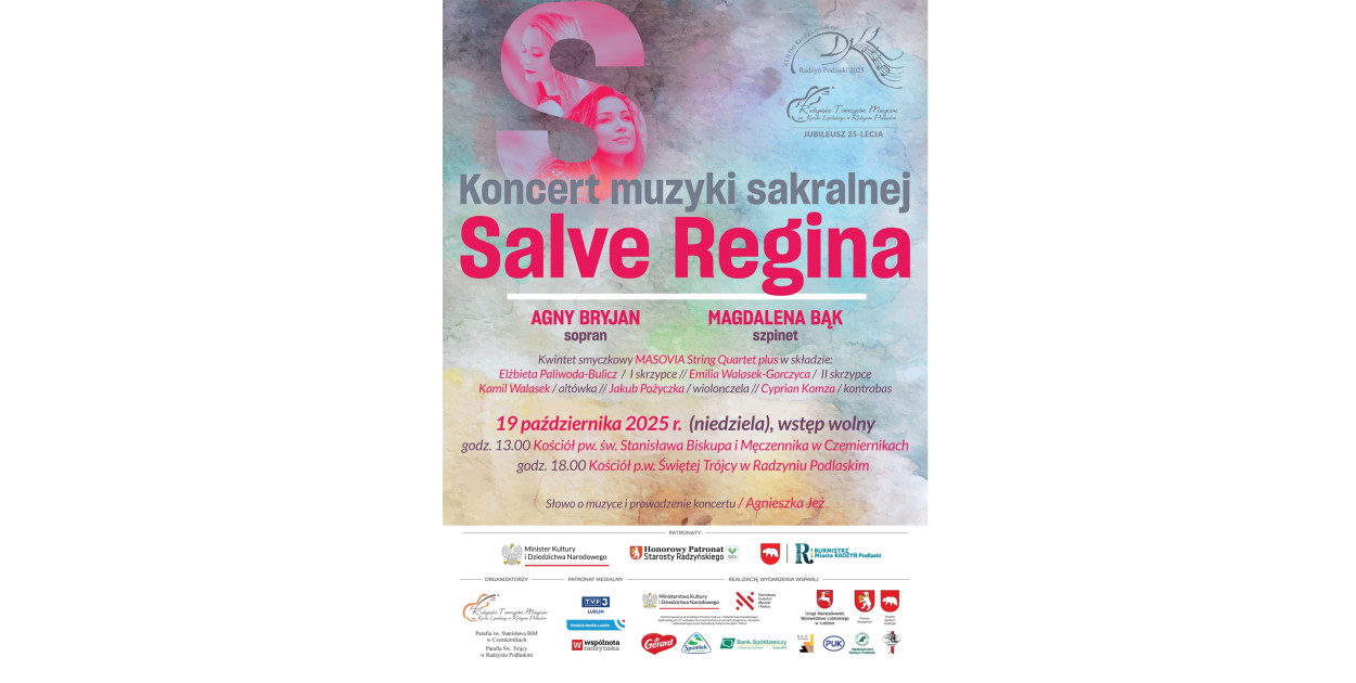 Radzyńskie Towarzystwo Muzyczne im. Karola Lipińskiego zaprasza na dwa koncerty muzyki sakralnej: pierwszy o godz. 13.00 w kościele p. w. św. Stanisława Biskupa i Męczennika w Czemiernikach, a drugi o godz. 18.00 w kościele p. w. Trójcy Świętej w Radzyniu. Koncert "Salve Regina" wykonają: Agny Bryjan (sopran), Magdalena Bąk (szpinet) i kwintet smyczkowy Masovia String Quartet plus. Wstęp będzie wolny. Więcej szczegółów dotyczących obu koncertów można znaleźć na plakacie poniżej.