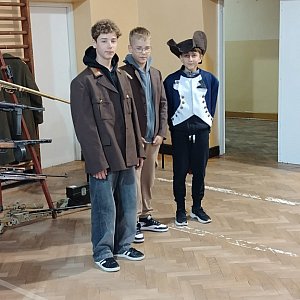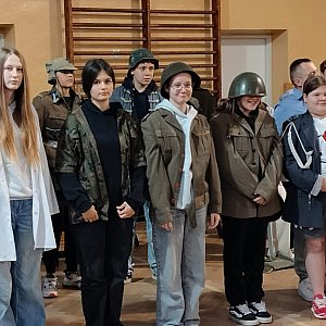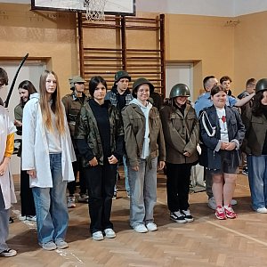 Ogromnym zainteresowaniem cieszyła się część pokazowa, w której uczniowie mogli aktywnie uczestniczyć. Chętni mieli możliwość przymierzenia mundurów żołnierskich, hełmów i plecaków, a także poznania działania wybranych elementów wyposażenia wojskowego. W trakcie zajęć odbyły się również krótkie inscenizacje historyczne, w których uczniowie wcielali się w role żołnierzy, sanitariuszy i mieszkańców okupowanej Polski. Dzięki temu mogli lepiej zrozumieć, jak wyglądało życie w czasie wojny i z jakimi trudnościami mierzyli się ludzie w tamtym okresie.
