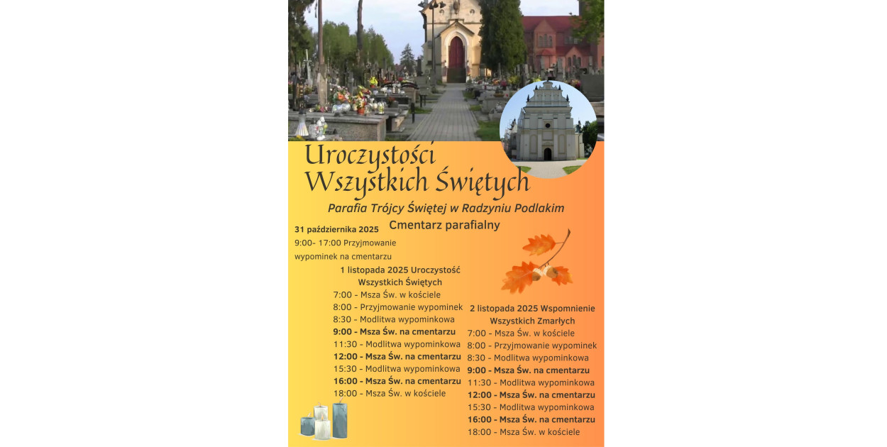 Zbliżają się Uroczystość Wszystkich Świętych i Dzień Zaduszny. Prezentujemy program obchodów święta na Cmentarzu Parafialnym (starym cmentarzu) oraz w parafii Trójcy Świętej, to jest godziny rozpoczęcia mszy na cmentarzu i w kościele, a także modlitw wypominkowych.