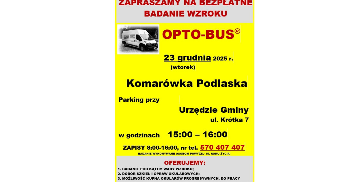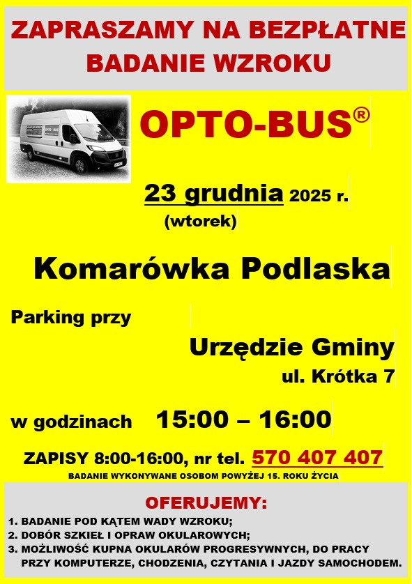 Władze gminy Komarówka Podlaska zapraszają mieszkańców na bezpłatne badanie wzroku. Szczegóły można znaleźć na plakacie poniżej.