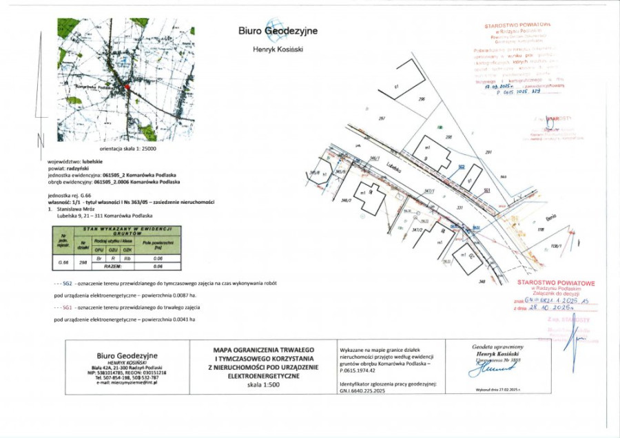 Starosta radzyński, wykonując zadania z zakresu administracji rządowej, wydał decyzję z dnia 28 października 2025 r. w sprawie ograniczenia sposobu korzystania z nieruchomości o nieuregulowanym stanie prawnym, położonej w obrębie ewidencyjnym Komarówka Podlaska, działka nr 298. Decyzja została wydana na wniosek PGE Dystrybucja S.A. i dotyczy realizacji inwestycji celu publicznego – budowy elektroenergetycznej sieci kablowej niskiego napięcia 0,4 kV, która zastąpi istniejącą sieć napowietrzną. Z treścią decyzji można zapoznać się, wchodząc w link: