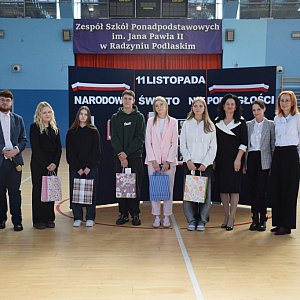 Społeczność Zespołu Szkół Ponadpodstawowych im. Jana Pawła II w Radzyniu Podlaskim uczciła Narodowe Święto Niepodległości uroczystą akademią, podczas której nie zabrakło refleksji, symboli narodowych i wspólnego odśpiewania Hymnu Państwowego. Na zakończenie uroczystości zwycięzcom konkursu historycznego wręczono nagrody.