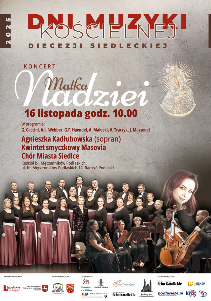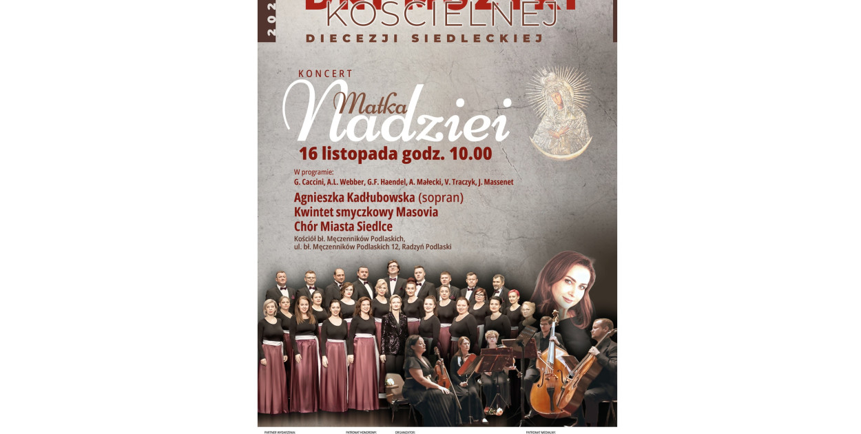 16 listopada w kościele p. w. Błogosławionych Męczenników Podlaskich w Radzyniu Podlaskim odbędzie się koncert muzyki sakralnej "Matka nadziei". Rozpocznie się o 10:00. Wydarzenie zainauguruje V Dni Muzyki Kościelnej Diecezji Siedleckiej. Szczegóły można znaleźć na plakacie poniżej.