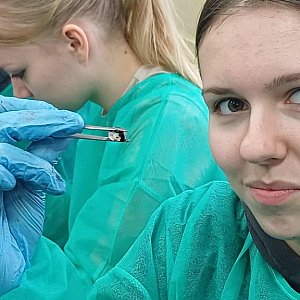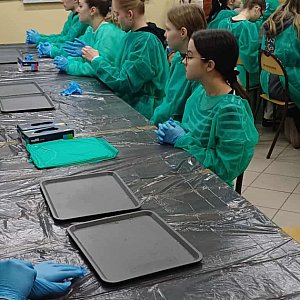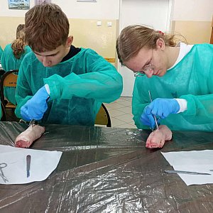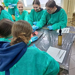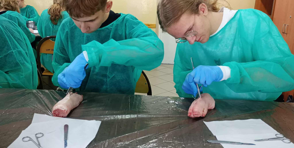 W listopadzie 2025 roku odbyły się warsztaty anatomiczno-chirurgiczne, podczas których uczniowie biologiczno-chemicznych klas 2a, 3a i 4a z I Liceum Ogólnokształcącego w Radzyniu Podlaskim mieli okazję wykonać sekcję serca oraz oka, a także szczegółowo poznać budowę płuc. Dodatkowo uczyli się wykonywania szycia chirurgicznego na prawdziwych narządach. Pod okiem pani Dominiki z firmy Domingo uczniowie zdobyli praktyczne umiejętności i dokładnie poznali anatomię preparowanych narządów. Ubrani w profesjonalne stroje ochronne oraz wyposażeni w specjalistyczne narzędzia — skalpele, nożyczki i inne przyrządy chirurgiczne — pracowali jak prawdziwi adepci medycyny.