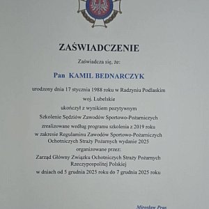 Druh Kamil Bednarczyk, strażak-ochotnik z Ochotniczej Straży Pożarnej w Komarówce Podlaskiej w dniach od 5 do 7 grudnia 2025 r. w Zakrzowie przechodził i ostatecznie pomyślnie ukończył specjalne szkolenie sędziów zawodów sportowo-pożarniczych, organizowane przez Zarząd Główny ZOSP RP.