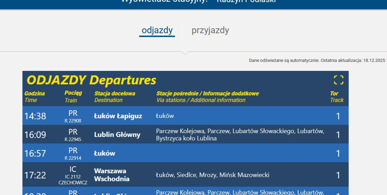 Zamieszczamy linka do wyświetlacza stacji Radzyń Podlaski - Bedlno Radzyńskie: