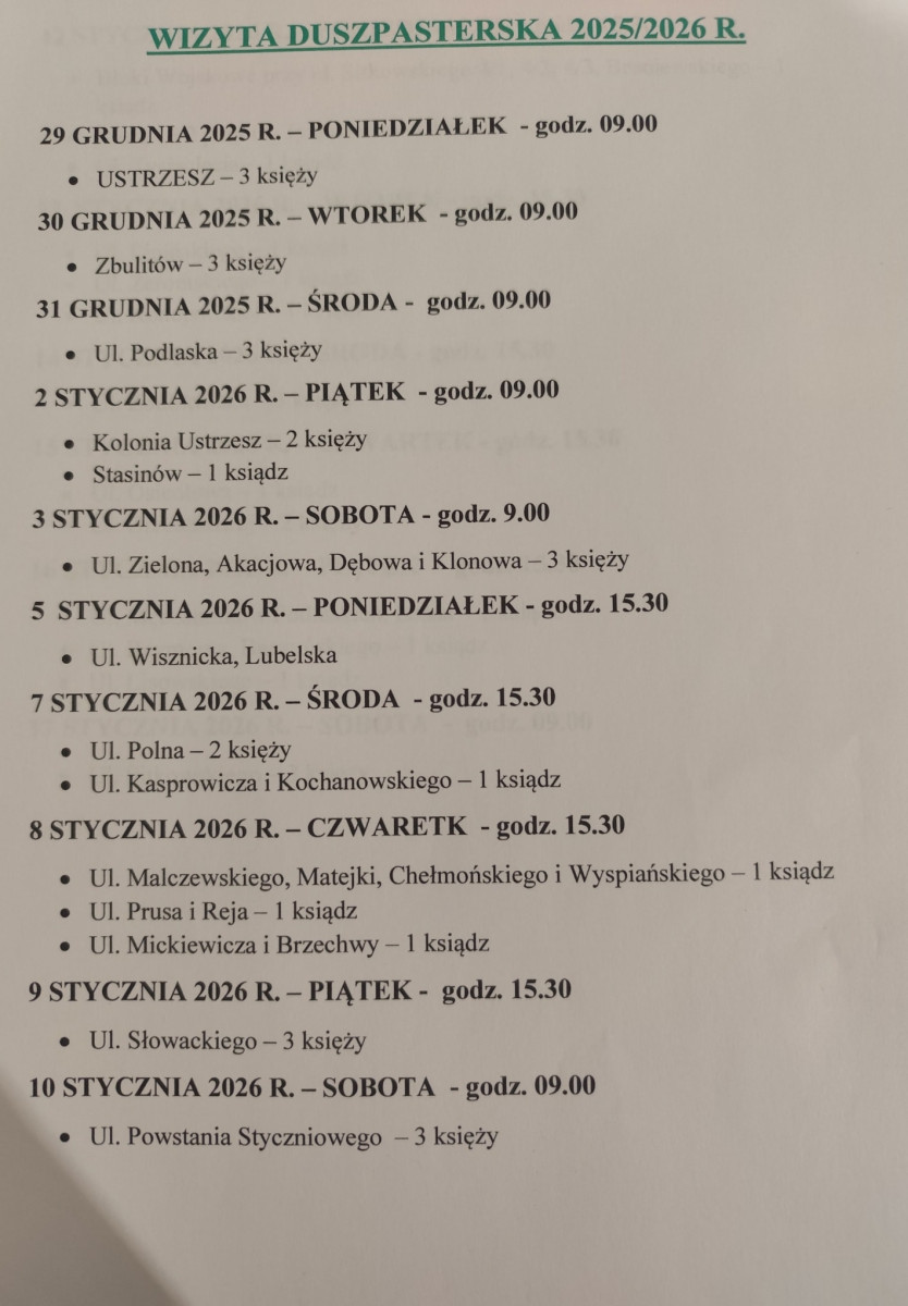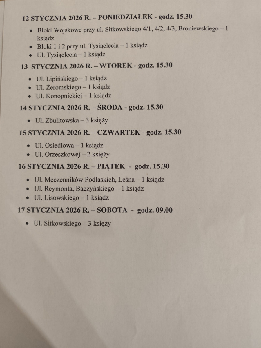 Zamieszczamy harmonogram wizyt duszpasterskich w parafii p. w. św. Anny w Radzyniu Podlaskim do 17 stycznia.