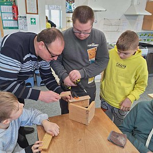 Uczniowie szkoły podstawowej działającej w ramach Specjalnego Ośrodka Szkolno-Wychowawczego w Radzyniu Podlaskim wzięli udział w zajęciach technicznych zorganizowanych pod kierunkiem pana Michała Micha. W ich trakcie wykonali drewniane karmniki dla ptaków. Starsi uczniowie z dużym zaangażowaniem pomagali młodszym kolegom, dzieląc się wiedzą i umiejętnościami podczas pracy z drewnem. Wykonane karmniki uczniowie zabrali do domu, aby wspólnie z rodzicami powiesić je w swoim otoczeniu i razem dokarmiać ptaki zimą.