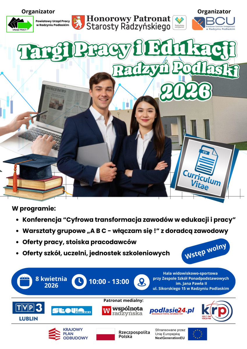 Powiatowy Urząd Pracy w Radzyniu Podlaskim oraz Branżowe Centrum Umiejętności w dziedzinie zawodowej elektryka w Radzyniu Podlaskim zapraszają do udziału w Targach Pracy i Edukacji Radzyń Podlaski 2026 , które odbędą się w dniu 8 kwietnia 2026 r. w godzinach od 10.00 do 13.00 w Hali Widowiskowo-Sportowej przy Zespole Szkół Ponadpodstawowych im. Jana Pawła II w Radzyniu Podlaskim, ul. Sikorskiego 15.