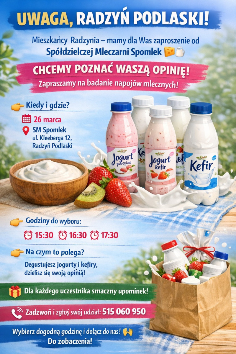 Spółdzielnia Mleczarska "Spomlek" zaprasza mieszkańców Radzynia do udziału w badaniu konsumenckim produktów mleczarskich, które mają zostać wprowadzić na rynek. Szczegóły są na plakacie poniżej.