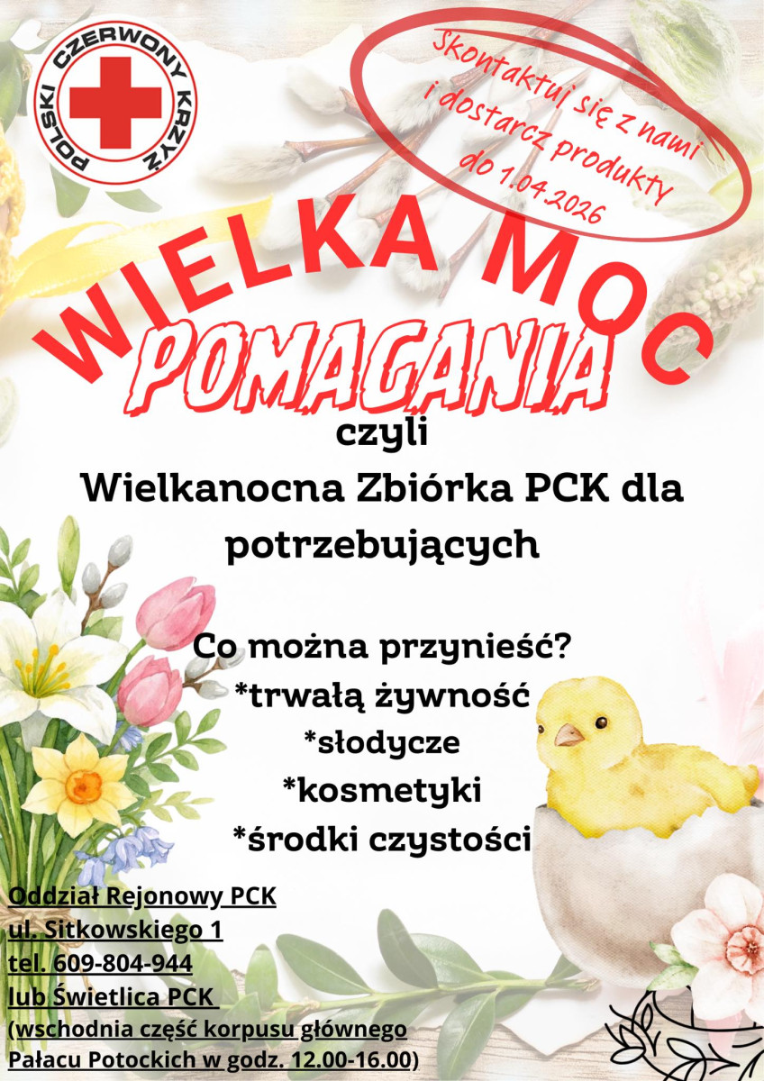 Można to wszystko dostarczać do piątku 1 kwietnia do Biura Oddziału Rejonowego PCK przy ul. Sitkowskiego 1 lub (w godzinach od 12:00 do 16:00) do świetlicy PCK we wschodniej części korpusu głównego pałacu Potockich.
