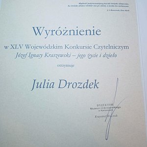 9 marca 2026 r. w Muzeum Józefa Ignacego Kraszewskiego w Romanowie odbył się finał konkursu "Józef Ignacy Kraszewski – jego życie i dzieło". Reprezentanci 8 szkół średnich z terenu województwa lubelskiego mieli za zadanie odpowiedzieć na 30 pytań otwartych z zakresu biografii i twórczości autora "Starej baśni". Podczas wydarzenia była możliwość obejrzenia wystawy stałej i czasowej pt. "Gdzie pisarz mieszka, czyli z wizytą u literatów" oraz wysłuchania koncertu w wykonaniu uczniów Zespołu Szkół Muzycznych I i II stopnia w Białej Podlaskiej. I Liceum Ogólnokształcące w Radzyniu Podlaskim reprezentowała Julia Drozdek z klasy 1b, która została przygotowana przez panią Małgorzatę Wójcik. Kapituła konkursu przyznała Julii wyróżnienie.