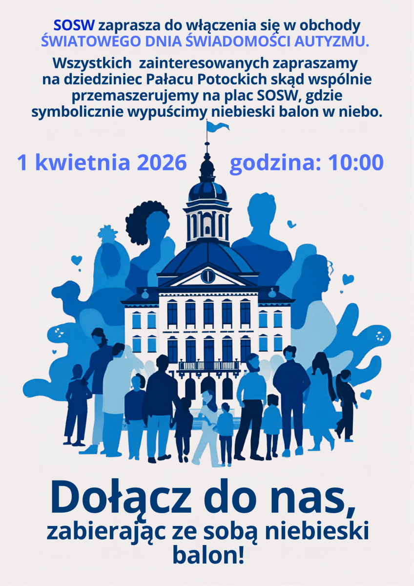 Specjalny Ośrodek Szkolno-Wychowawczy im. Zofii Sękowskiej zaprasza się do włączenia się w jutrzejsze obchody Światowego Dnia Świadomości Autyzmu. Szczegóły można znaleźć na plakacie poniżej.