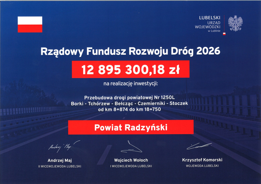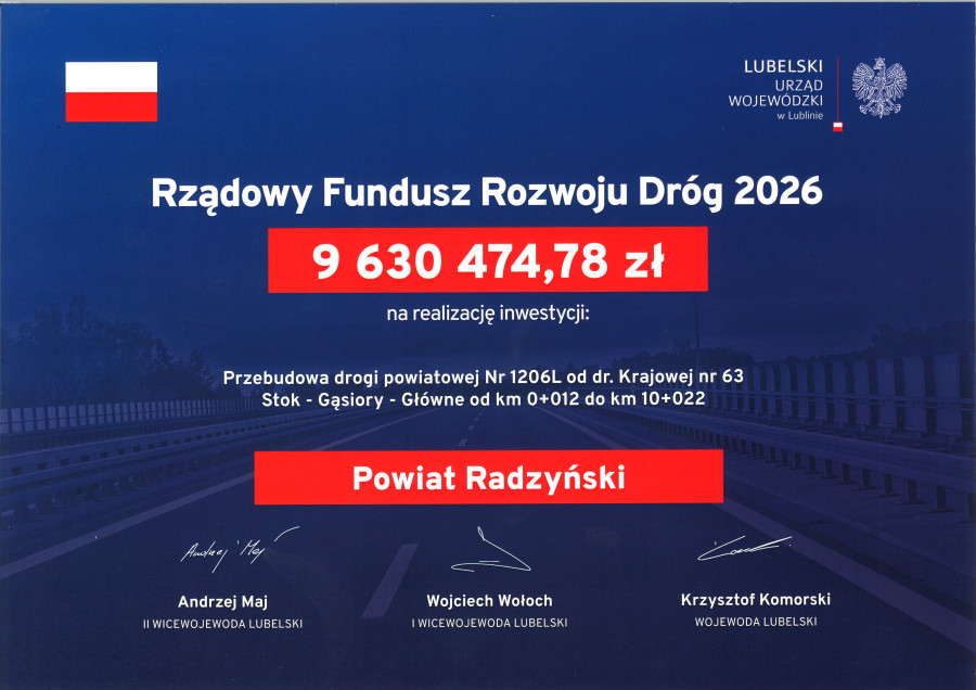 W Białej Podlaskiej oficjalnie podpisano umowy na realizację dwóch kluczowych inwestycji drogowych, które otrzymały dofinansowanie w ramach Rządowego Funduszu Rozwoju Dróg na rok 2026. W uroczystym podpisaniu dokumentów, które odbyło się w obecności Wojewody Lubelskiego Krzysztofa Komorskiego, udział wzięli przedstawiciele władz powiatu: starosta radzyński Szczepan Niebrzegowski, wicestarosta Ireneusz Mroczek oraz skarbnik powiatu Justyna Sałaj. Podczas wydarzenia obecny był również dyrektor Zarządu Dróg Powiatowych, Michał Zając.