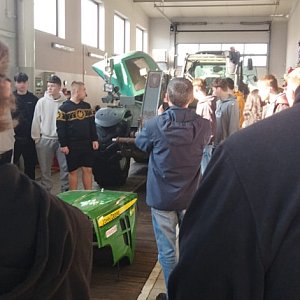 Pierwszym punktem programu była wizyta w serwisie maszyn rolniczych Agro-Sieć, gdzie uczniowie mieli okazję zobaczyć profesjonalny serwis ciągników marki John Deere oraz zapoznać się z procesem diagnostyki i naprawy nowoczesnych maszyn rolniczych.