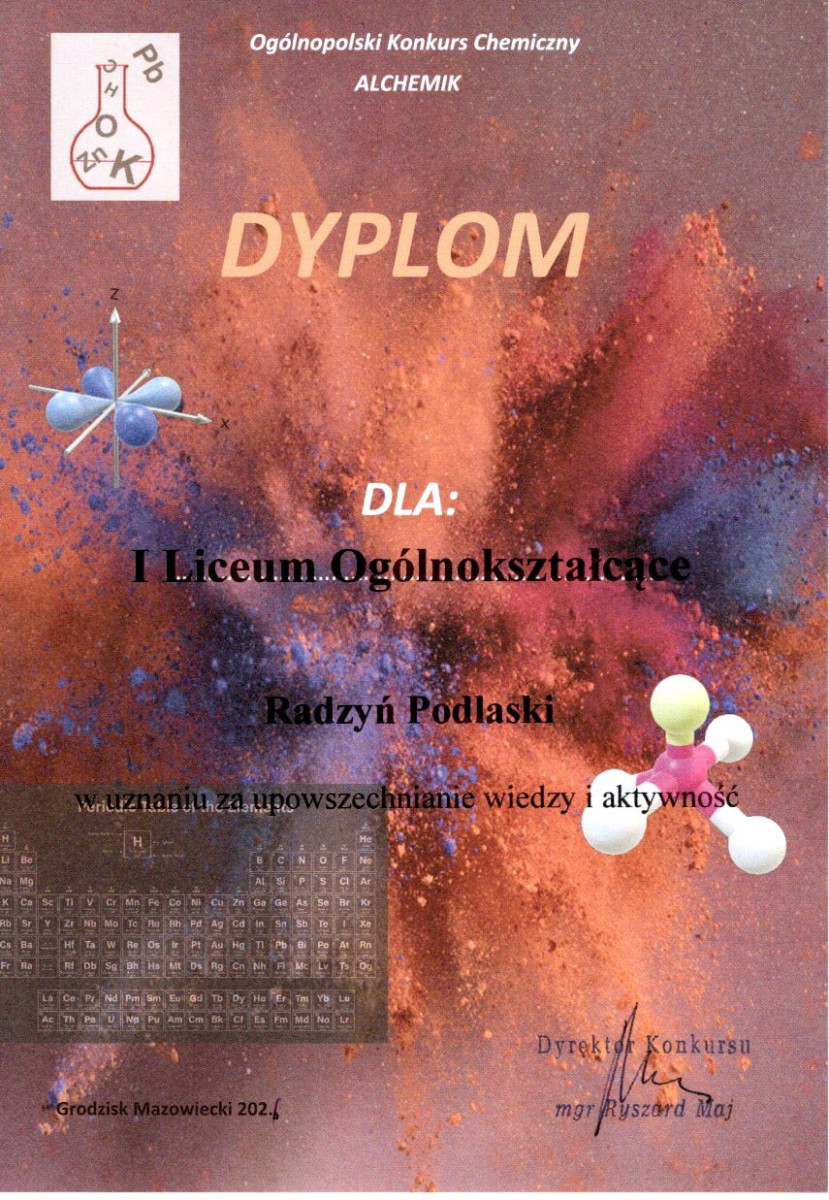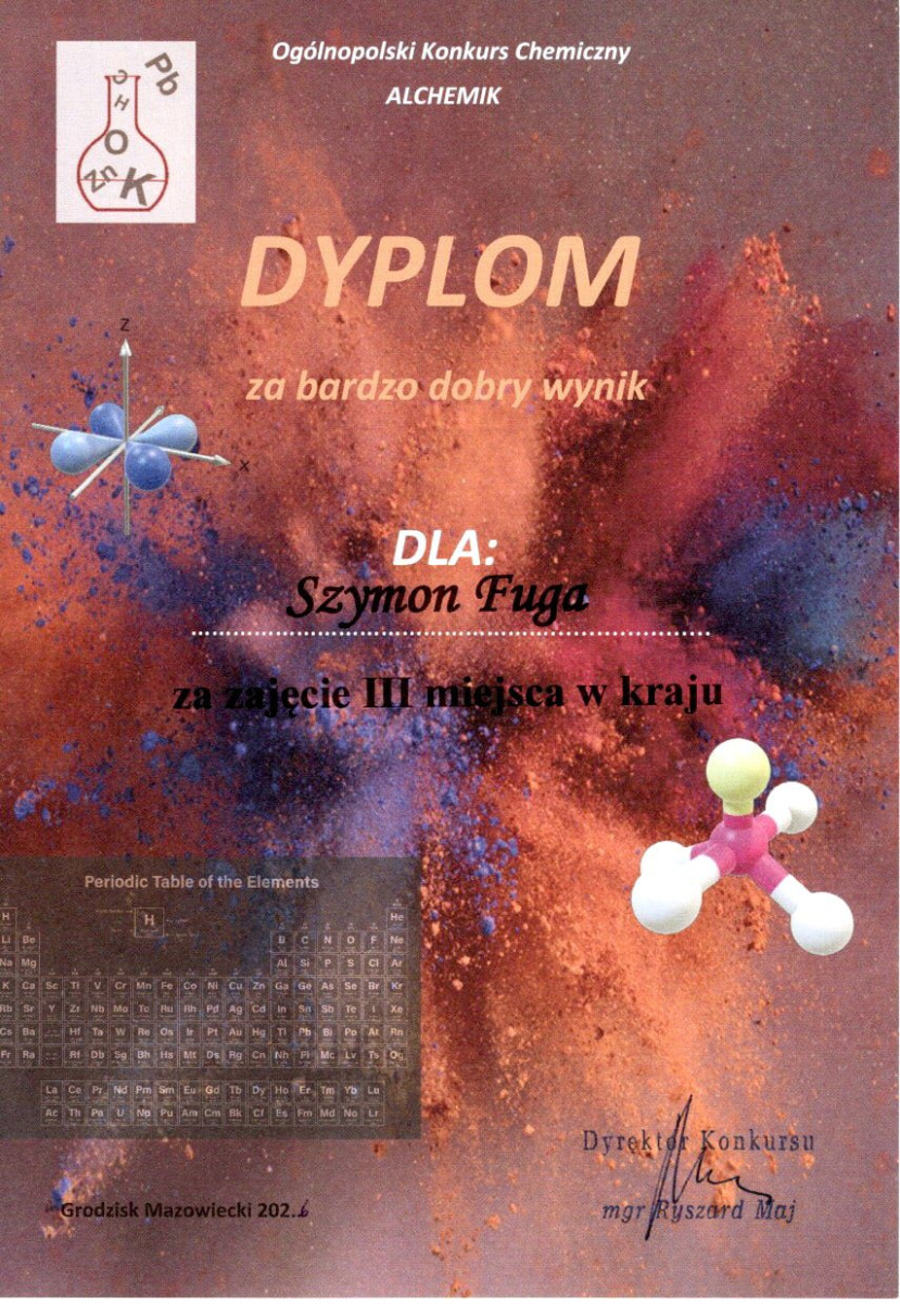 Uczeń I Liceum Ogólnokształcącego w Radzyniu Podlaskim - Szymon Fuga z klasy 2a - odniósł znaczący sukces, zdobywając III miejsce w Ogólnopolskim Konkursie Chemicznym "Alchemik" w edycji 2025/2026.