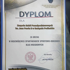 16 kwietnia 2026 r. ośmioro reprezentantów oddziału przygotowania wojskowego z Zespołu Szkół Ponadpodstawowych im. Jana Pawła II w Radzyniu Podlaskim wraz z opiekunem wzięli udział w Spartakiadzie sportowo-obronnej klas wojskowych województwa lubelskiego, która odbyła się w Radoryżu Smolanym. W zawodach rywalizowało 19 drużyn reprezentujących szkoły z całego województwa. Uczestnicy mierzyli się z różnorodnymi zadaniami, m.in. strzelaniem, rzutem granatem oraz konkurencjami sprawdzającymi sprawność fizyczną, w tym z torem przeszkód. Zawody miały na celu nie tylko wyłonienie najlepszej drużyny i zawodników w poszczególnych konkurencjach, ale także integrację środowiska klas wojskowych oraz upowszechnianie kultury fizycznej i promowanie ochotniczych form służby wojskowej.