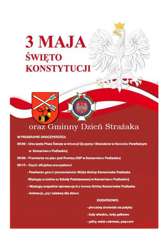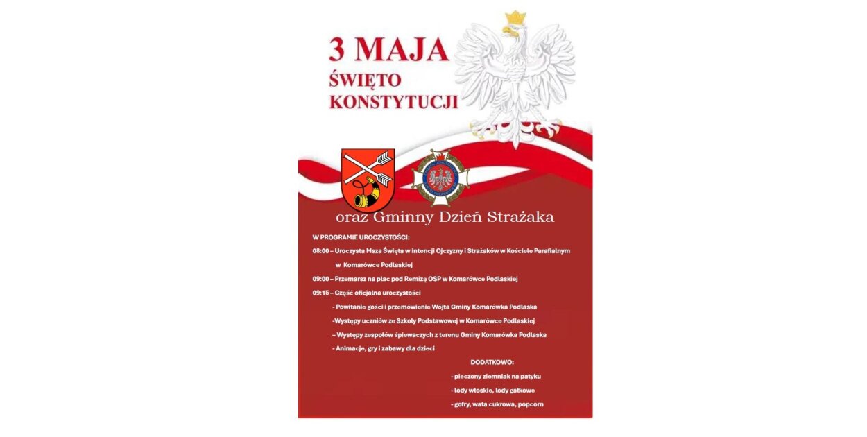 Wójt gminy Komarówka Podlaska zaprasza na obchody Święta Narodowego Trzeciego Maja.