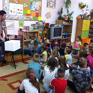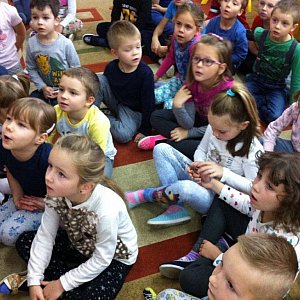 Przypomniał również, jak ważne dla zdrowia pupila są szczepienia ochronne. Pan weterynarz przyniósł ze sobą podstawowy sprzęt lekarski -stetoskop oraz różnych rozmiarów strzykawki, dostosowane do rozmiarów zwierzęcia. Dzieci przez moment mogły wcielić się w rolę lekarza.