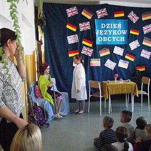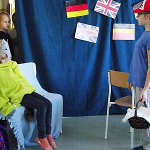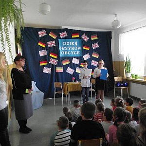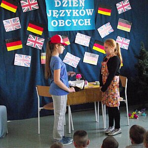 Uczniowie klasy V przygotowali współczesną wersję ,,Czerwonego Kapturka" w języku angielskim. Można było także usłyszeć wykonane przez uczennice klas starszych współczesne obcojęzyczne hity radiowe. Natomiast uczniowie klasy II zaprezentowali swoje umiejętności językowe w piosence ,, Family Finger".Na koniec uroczystości Pani Dyrektor wręczyła dyplomy i nagrody uczniom, którzy uzyskali najlepsze wyniki w Szkolnym Konkursie Wiedzy o Wielkiej Brytanii.