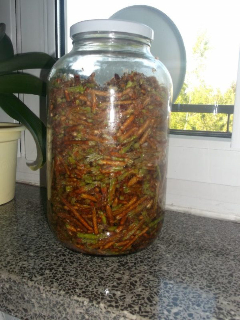Zrywamy pędy boczne. Tzw. "koconki" sosnowe, jeśli są dłuższe kroimy na ok. 2-3 cm odcinki, potem zasypujemy cukrem w słoiku, przykrywamy ściereczką. Ustawmy słoik w ciepłym miejscu.