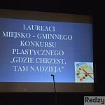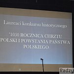 W dzisiejsze, piątkowe przedpołudnie w sali kinowej Radzyńskiego Ośrodka Kultury odbyła się sesja naukowa dla młodzieży pn. "1050-rocznica Chrztu Polski i powstania państwa polskiego". Przed nią odbyło się uroczyste wręczenie nagród laureatom konkursów plastycznego, recytatorskiego, historycznego i literackiego oraz zwycięzców przeglądu pieśni patriotycznych, związanych z obchodzonym jubileuszem.